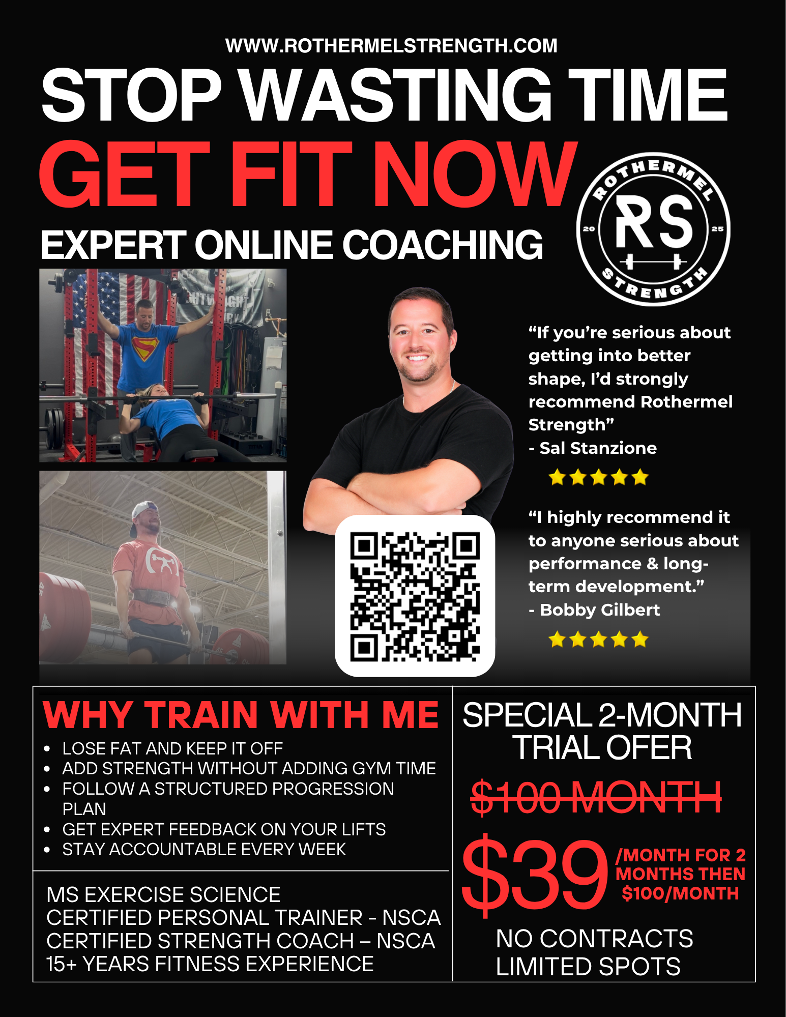 The field of exercise and nutrition can be a very confusing place because there are so many different opinions on nearly every topic, however at Rothermel Strength, I cut through the confusion and rely on basic, foundational principles. Focusing on the process rather than the outcome encourages clients to consistently do the things necessary that will ultimately result in achievement.